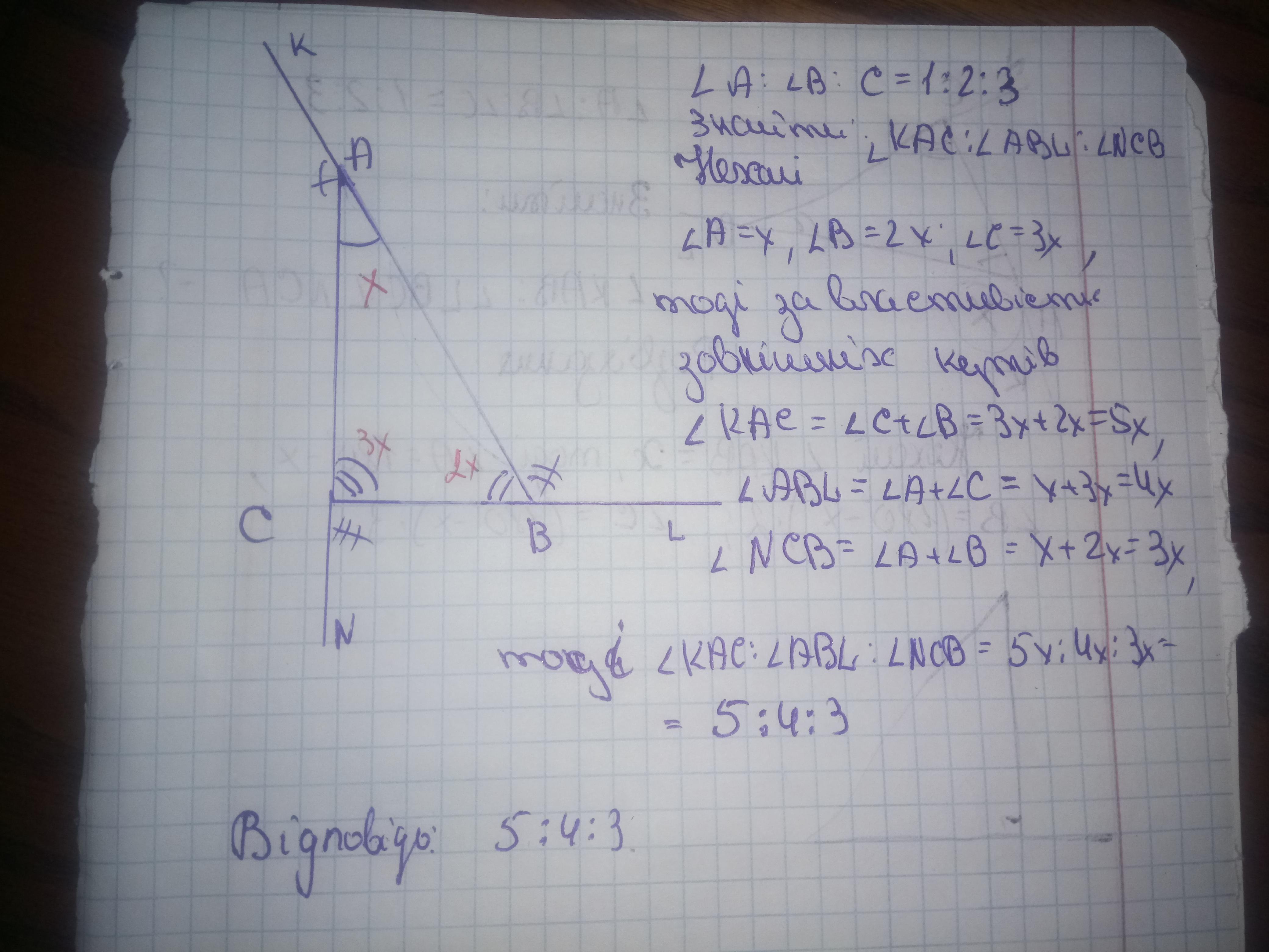 внутрішні кути трикутника відносяться як 1 : 2 : 3 знайдіть відношення зовнішніх кутів цього трикутника