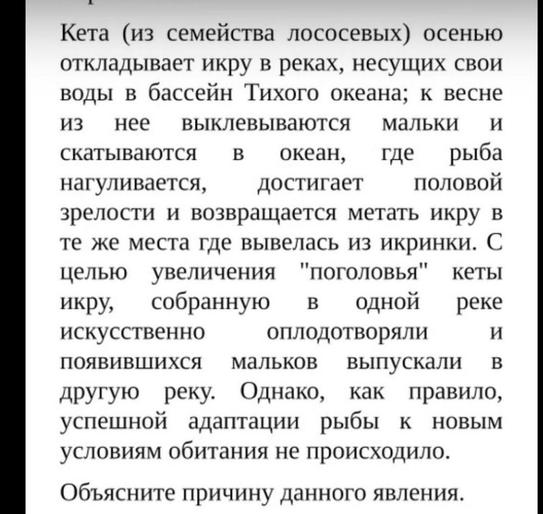 1. Рыбы данного вида не были приспособлены к обитанию в реках, ведь мальки должны обитать в океане, причем именно в Тихом. Так как они приспособлены только к этой среде обитания
