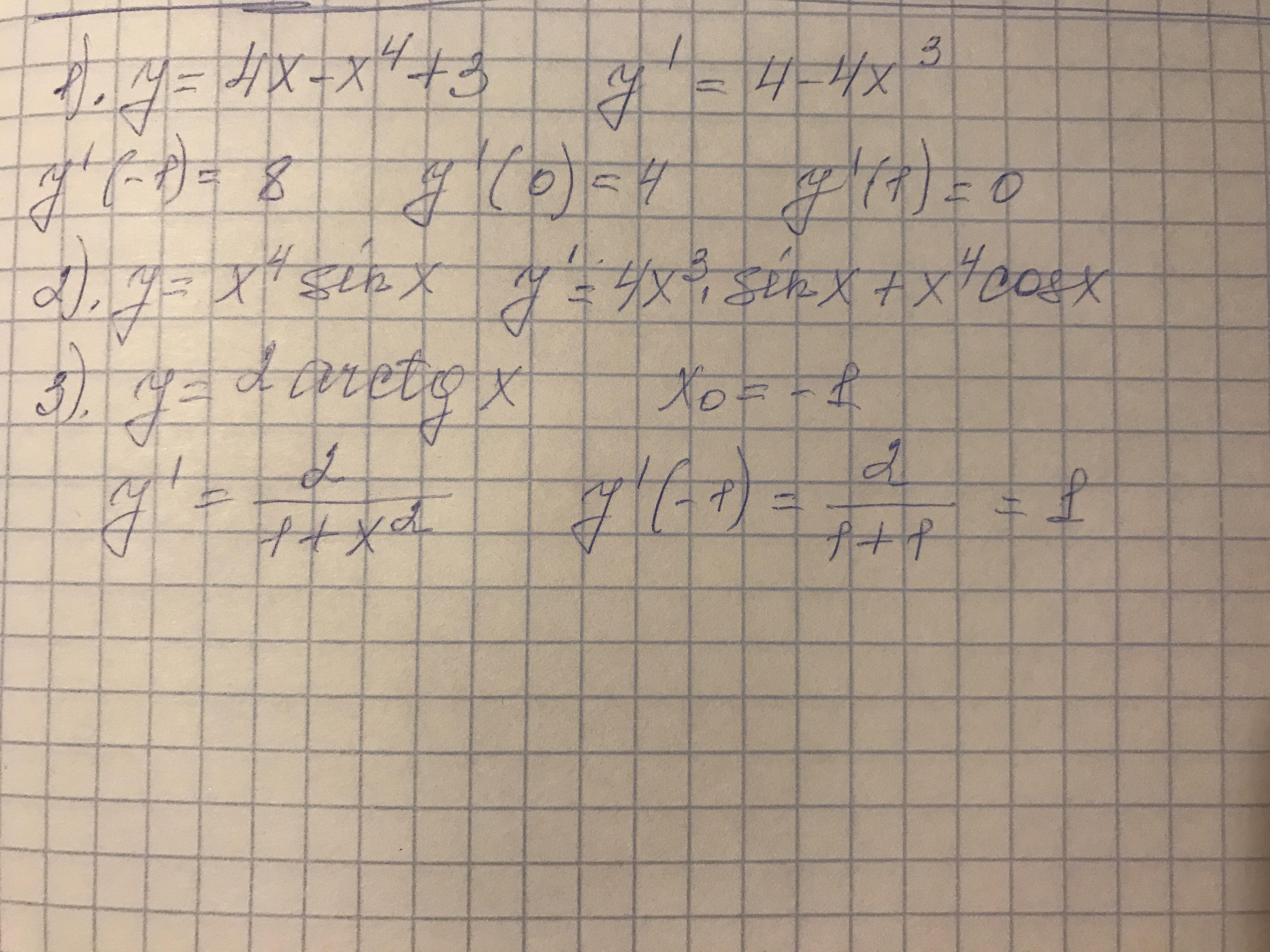 Помогите плиз 1. Дана функция y=4x-x^{4} + 3. Установите соответствие между производными функции в соответствующих точках и их значениями: a) y'(-1) ( )0; б) y'(0) ( )8; в) y'(1) ( )4 2. Производная функции y=x^{4} sin x имеет вид: а) y'=4x^{3} cos x; б) y'=4x^{3} sin x- x^{4} cos x; в) y'=4x^{3} + cos x; г) y'=4x^{3} sin x + x^{4} cos x 3. Производная функции y=2arctgx в точке x_{0} = -1 равна: а) 1; б) 2; в) -1; г) 0