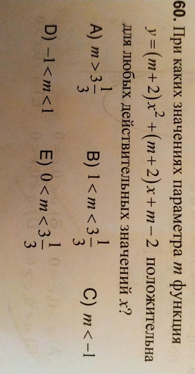 2) Если m≠-2, получаем квадратичную функцию относительно х. Если первый коэффициент этой функции больше нуля, а дискриминант меньше нуля, то функция положительна при любом действительном значении х.