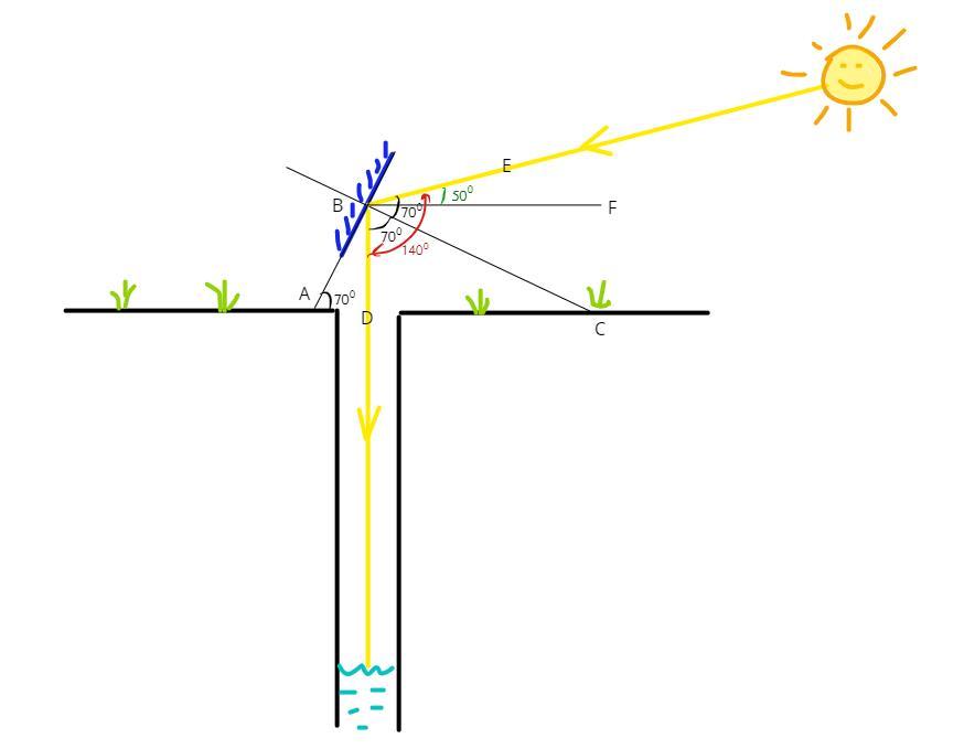 чтобы осветить отраженным от плоского зеркала солнечным светом дно глубокого колодца, зеркало установили под углом 70 градусов к горизонту. какой угол ( в градусах) составляет с горизонтом падающие солнечные лучи ?