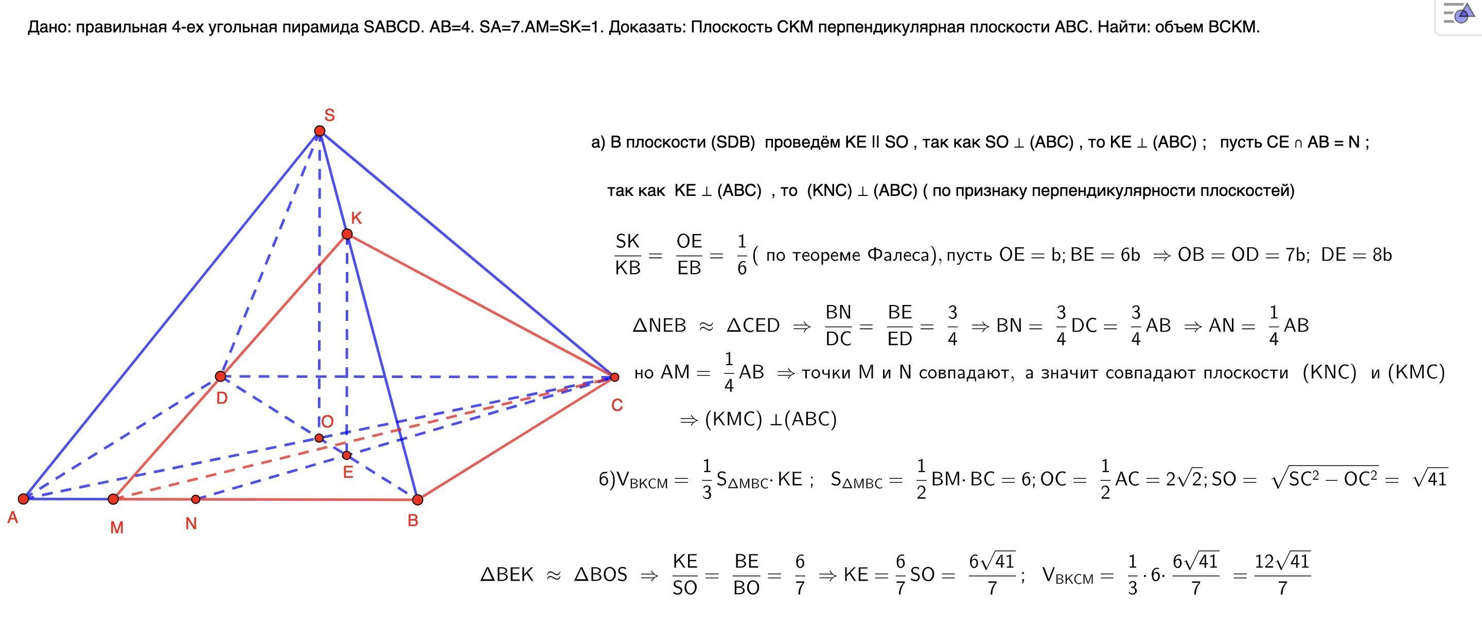 Дано: правильная 4-ех угольная пирамида SABCD. AB=4. SA=7.AM=SK=1. Доказать: Плоскость CKM перпендикулярная плоскости ABC. Найти: объем BCKM. Это 14 задача из егэ по профильной математике.