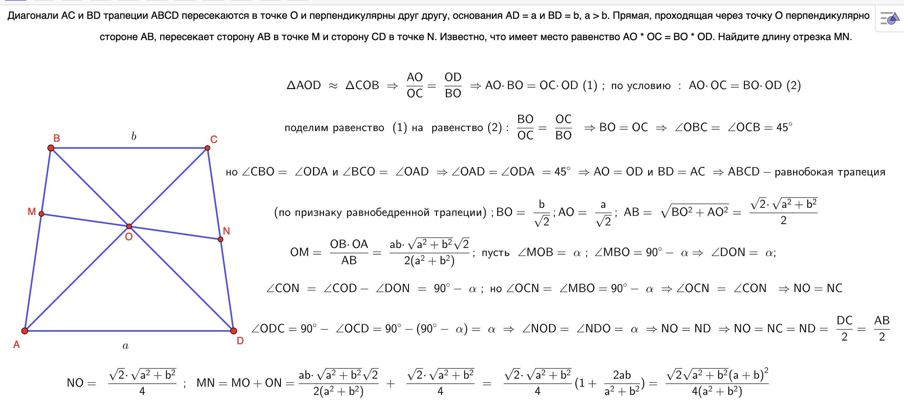 Диагонали AC и BD трапеции ABCD пересекаются в точке O и перпендикулярны друг другу, основания AD = a и BD = b, a > b. Прямая, проходящая через точку O перпендикулярно стороне AB, пересекает сторону AB в точке M и сторону CD в точке N. Известно, что имеет место равенство AO * OC = BO * OD. Найдите длину отрезка MN.