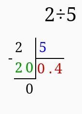 Дробная черта означает знак деления. Поэтому делим 2 на 5 в столбик.
