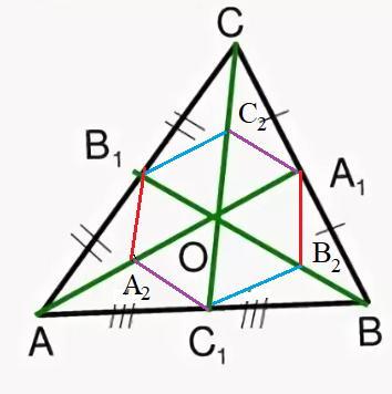 В треугольнике `ABC` его медианы `A A_1`, `B B_1` и `C C_1` пересекаются в точке `O`. Середины отрезков `OA`, `OB` и `OC` обозначены соответственно `A_2`, `B_2` и `C_2`. Выразите периметр шестиугольника `A_2C_1B_2A_1C_2B_1` через медианы `m_a=A A_1`, `m_b=B B_1`, `m_c=C C_1`.