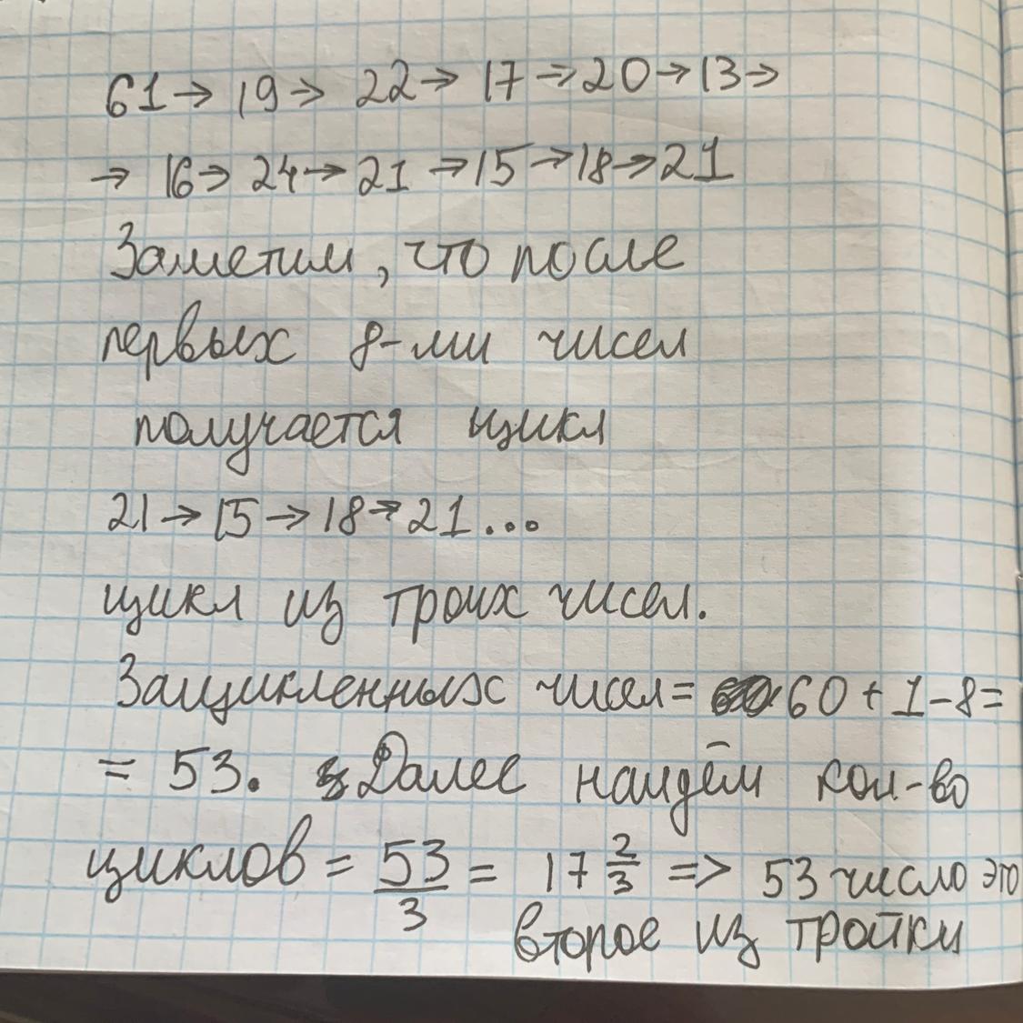 ...(продолжение решения из листочка) Почему оно второе из цикла? потому что остаток 2. Т.е. у нас есть какое-то целое количество циклов , тогда с числа , которе остаток 1 начинается наш последний цикл, а т.к. остаток два идет после числа остаток 1 , то оно последнее за час и второе в цикле ---> ответ 15