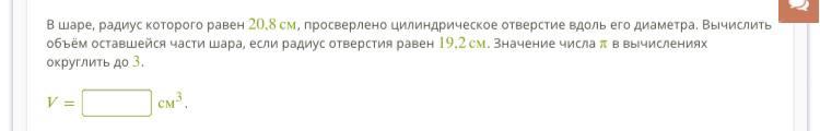 В шаре, радиус которого равен 20,8см, просверлено цилиндрическое отверстие вдоль его диаметра. Вычислить объём оставшейся части шара, если радиус отверстия равен 19,2см. Значение числа π в вычислениях округлить до 3.