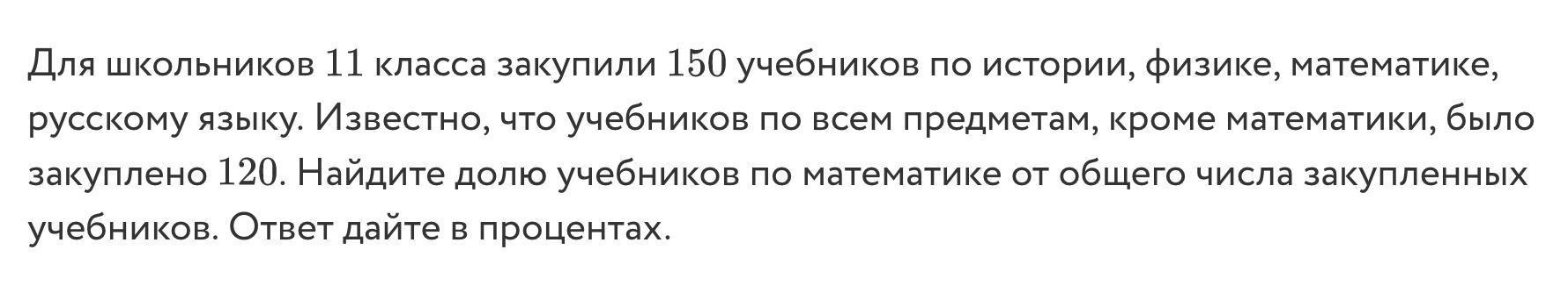 Всего закуплено 150 учебников, без математики закуплено 120 учебников т.е 150-120=30 учебников по математике
