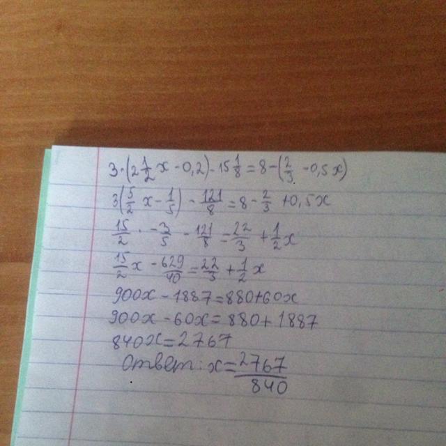 3*(2 1/2х - 0.2)-15 1/8 =8-(2/3-0.5х)
