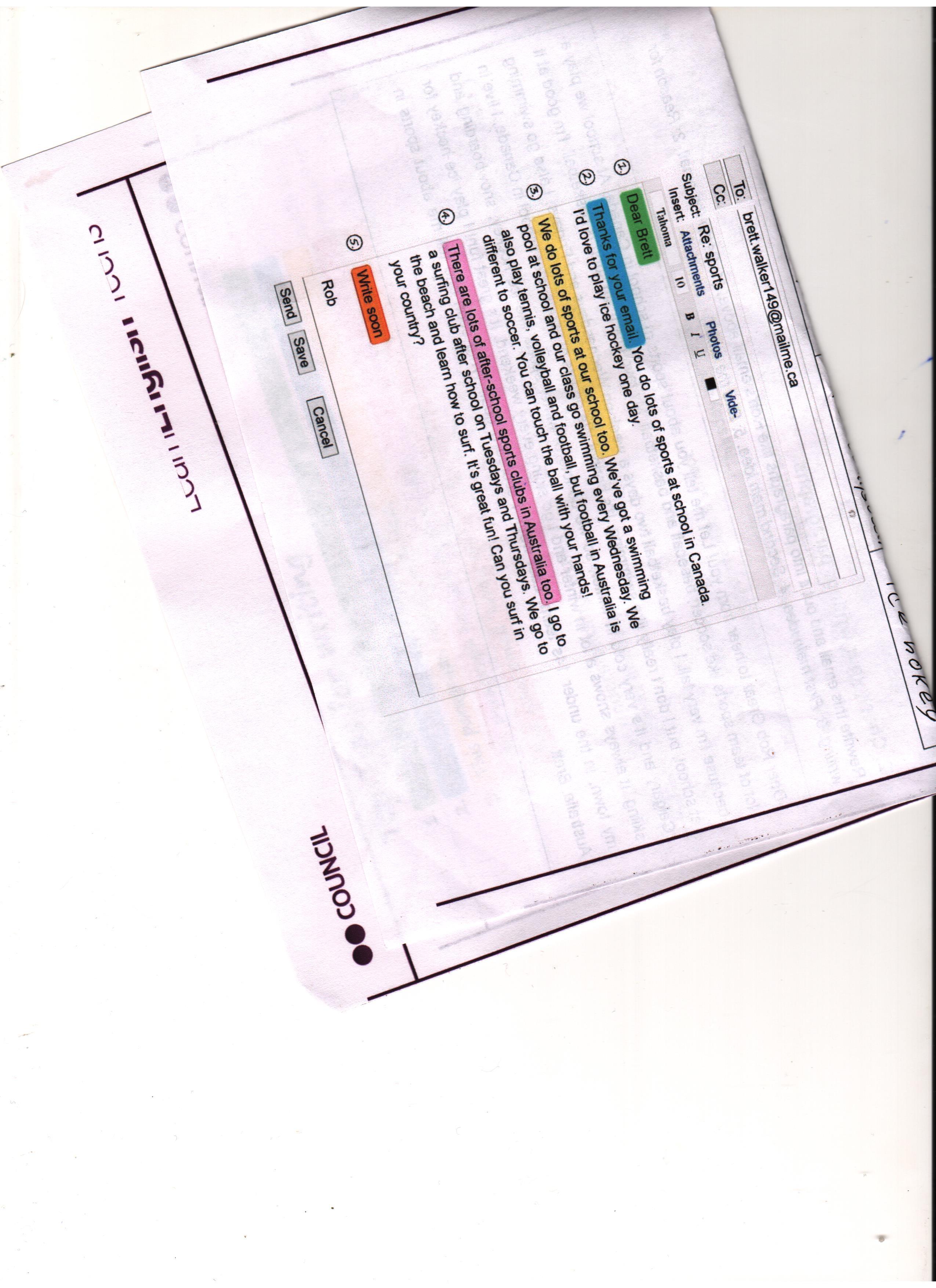 Тема: спорт. O Спасибо за ваше письмо Вы много занимаетесь спортом в школе в Канаде. Я бы хотел однажды сыграть в хоккей с шайбой O Мы делаем в нашей школе тоже много спорта. У нас есть школа плавания, и наш класс каждую среду занимается плаванием. Мы играем в теннис, волейбол и футбол, но футбол в Австралии отличается от футбола. Вы можете коснуться мяча руками! В Австралии также есть много внешкольных спортивных клубов. Я хожу в серфинг-клуб после школы по вторникам и четвергам. Мы идем на пляж и учимся серфингу, это очень весело! Вы умеете заниматься серфингом в своей стране?