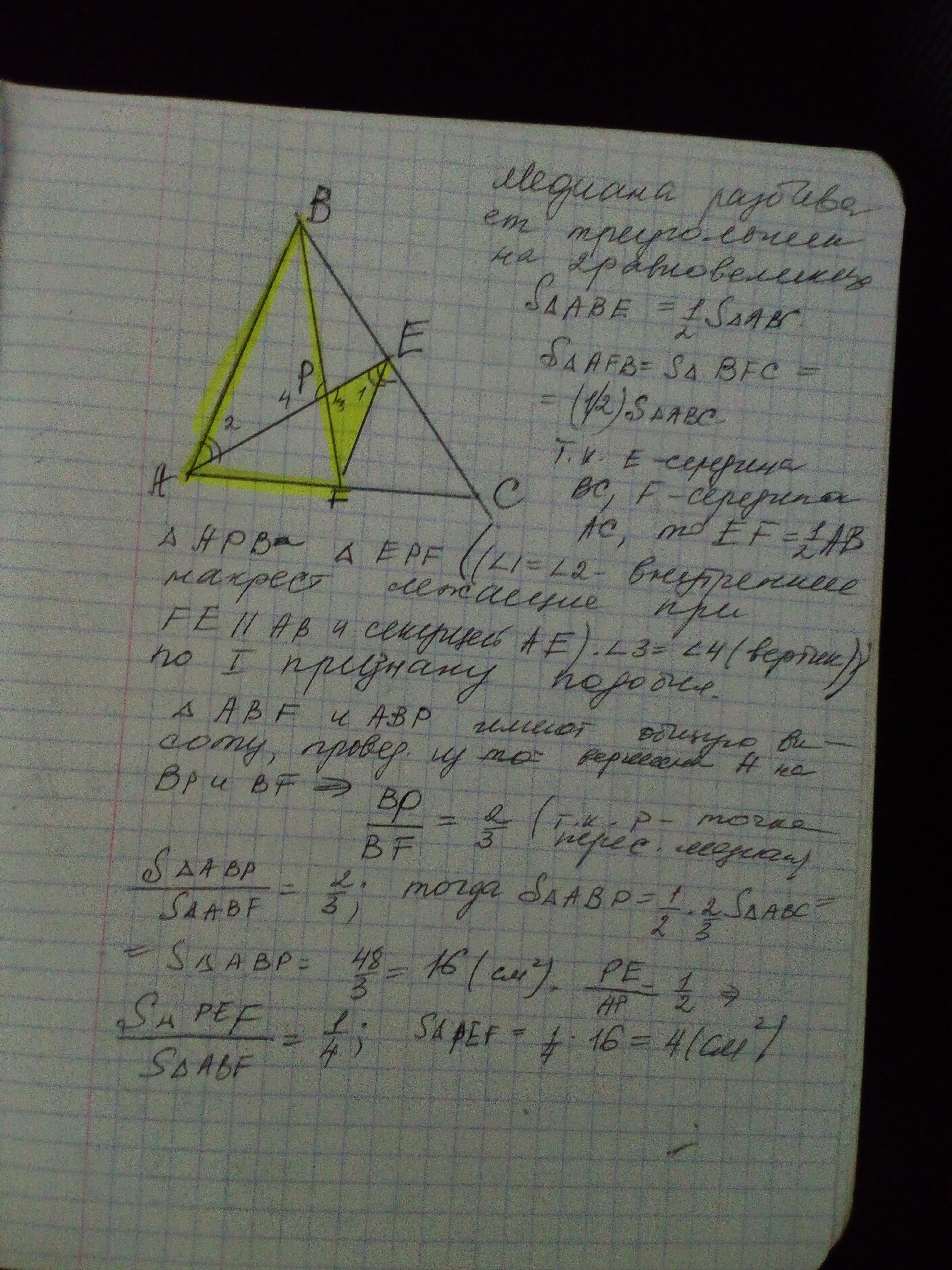 В треугольнике ABC медианы AE и BF пересекаются в точке P. Найдите площадь треугольника PEF , если площадь треугольника ABC равна48