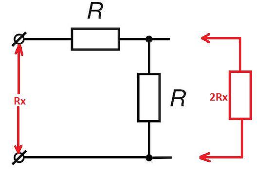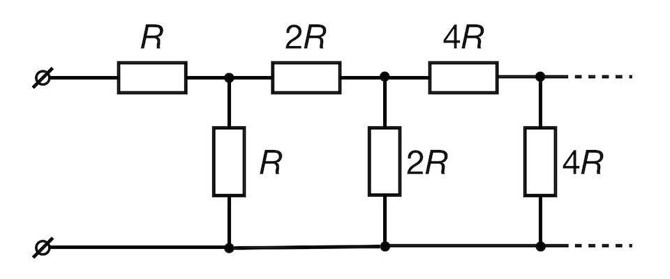 Заменим бесконечную часть цепи на эквивалентную (см. рисунок), при этом учтем, что при отбрасывании одного повторяющегося участка от бесконечной цепи ее общее сопротивление не изменится. Сопротивление эквивалентного участка равно удвоенному сопротивлению всей цепи (так как при удвоении каждого сопротивления в цепи, сопротивление всей цепи также удваивается). Составим уравнение: