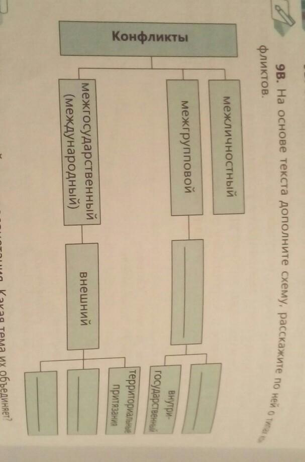 9B. На основе текста дополните схему, расскажите по ней о типах конфликтов.