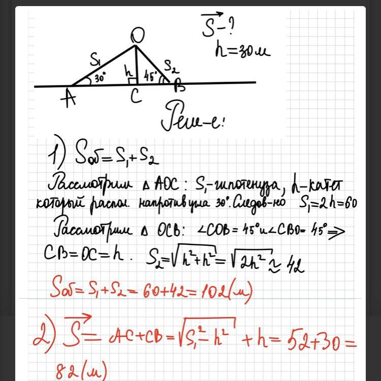 S=h/sin30 +h/sin45=30/0,5+30/0,7=60+42,857=102,86 м