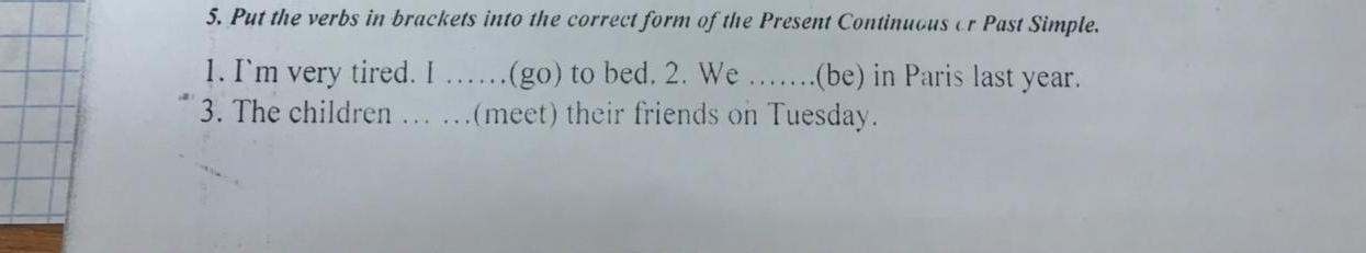 Ответ:1) I’m very tired. I going to bed. 2. We were in Paris last year. 3. The children met their friends on Tuesday.
