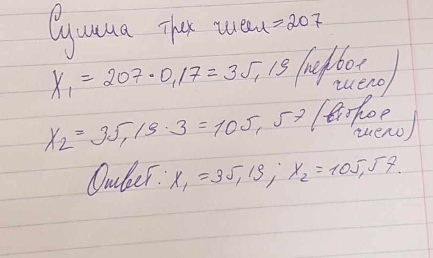 Сумма трёх чисел равна 207. Первое число составляет 17 % этой суммы. Второе число — в 3 раза больше