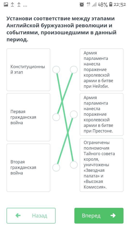 Установи соответствие между этапами Английской буржуазной революции и событиями, произошедшим в данный период.