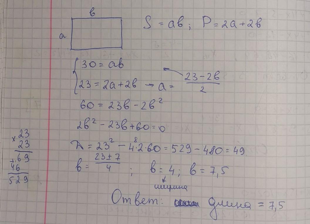 найдите длину прямоугольника с площадью 30 и периметром 23
