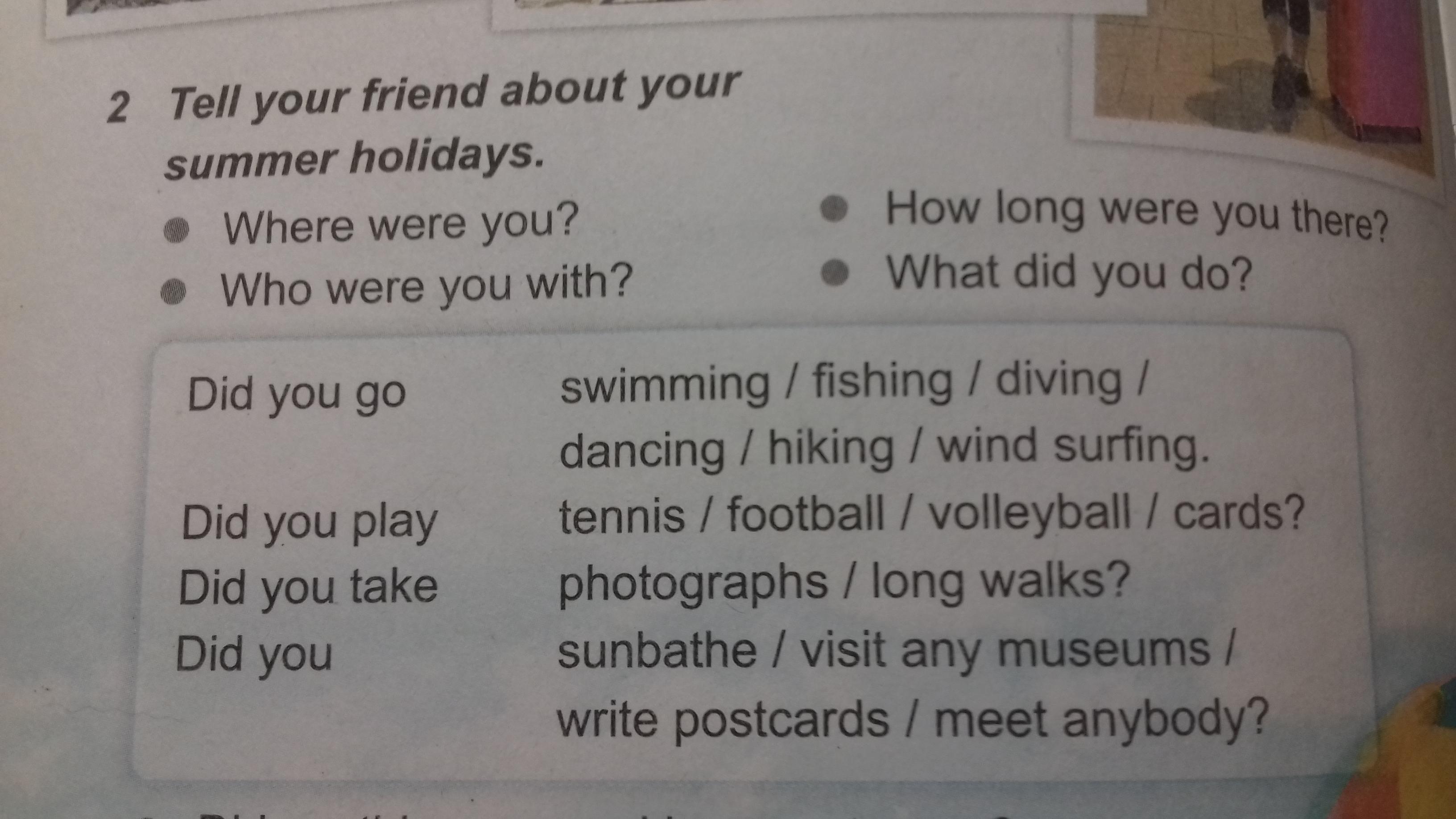 Hello, my dear friend! I want to tell you about my summer. It was very interesting, the most time I spent it at home with my friendly family. It wasn’t boring, my family helped me to find something to do. At my free time I went dancing (swimming / fishing/ diving/ hiking/ wind surfing), also I played football and cards with my friends. During the summer I met some my classmates who I missed very much. But I certainly have some memories from the holiday, I take some photos on my telephone, so every monent I can watch the pictures and remember this beautiful time!