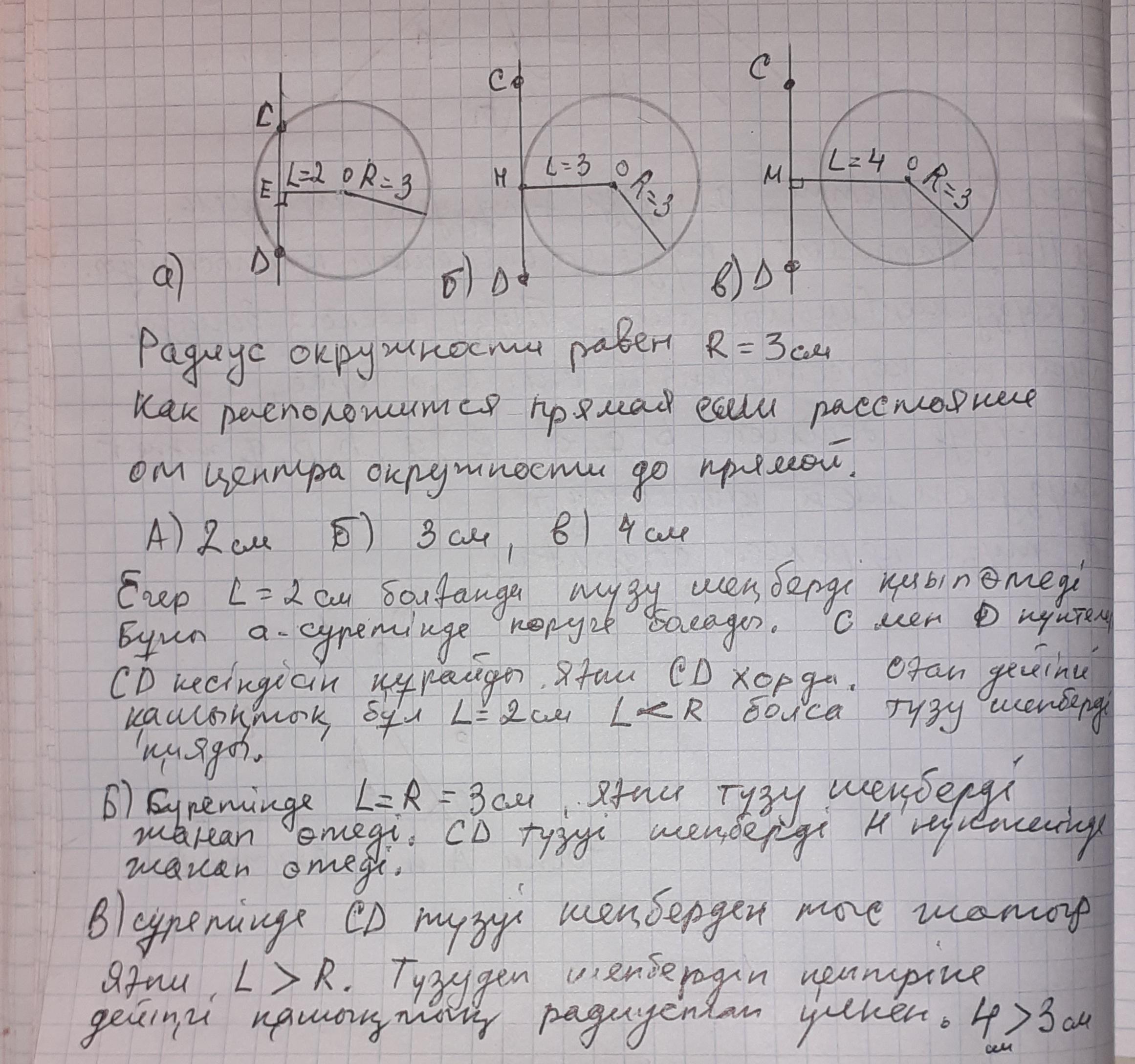 қашықтық: а) 2 см; ә) 3 см; б) 4 см болса, түзу мен шеңбер өзара