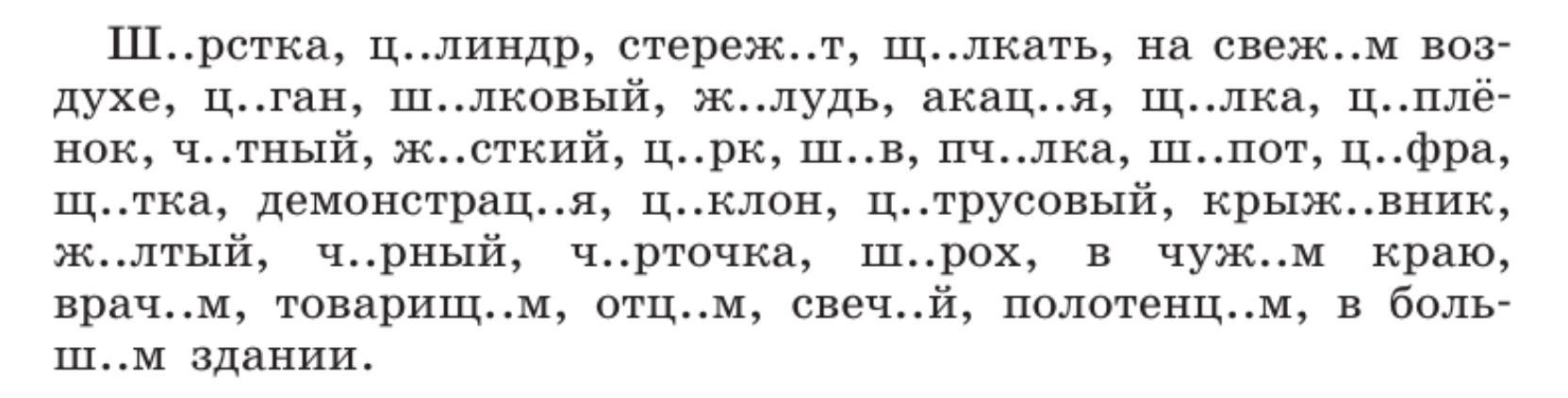 Шёрстка, цилиндр, стережёт,щёлкать, свежем,цыган, шелковый, жёлудь, акация, щелка, цыплёнок, чётный, жёсткий, цирк, шов, пчёлка, шёпот,цифра, щётка, демонстрация, циклон, цитрусовый, крыжовник, жёлтый, черный, чёрточка,шорох,чужом,врачом, товарищем, отцом, свечой, полотенцем, большом.