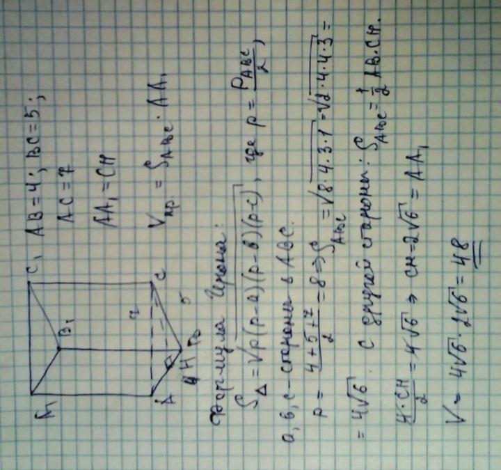 У прямій трикутній призмі сторони основи дорівнюють 4см, 5см і 7см, а бічне ребро дорівнює більшій высоте основи. Знайдіть об'єм призми. Помогите кто-то решить задачу, буду очень благодарна тем кто поможет, заранее спасибо?