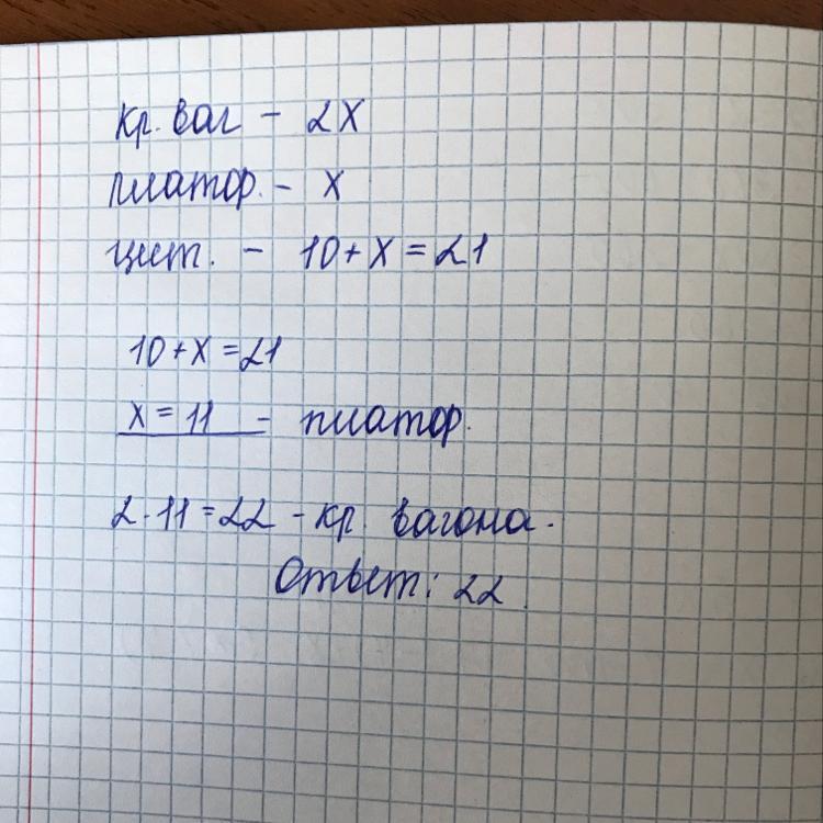 крытых вагонов в составе товарного поезда в 2 раза больше, чем платформ,а число цестерн на 10 больше,чем платформ. сколько всего вагонов в составн товарного поезда,если число цистерн 21? с фото задачи 1