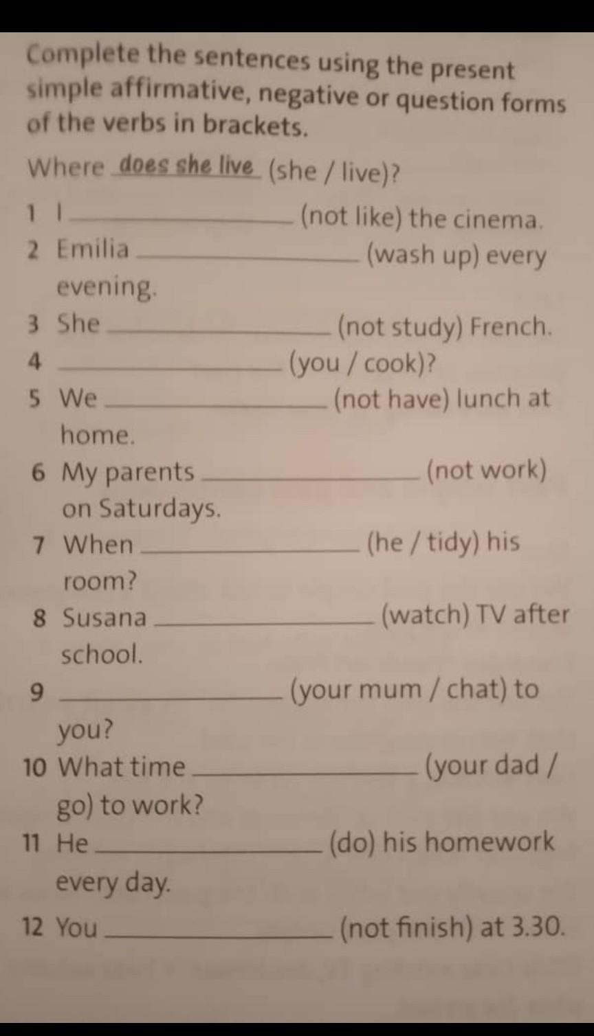 1 don't like 2 washs up 3 doesn't study 4 do you 5 don't have 6 don't work 7 does he tidy 8 watches 9 does your mum chat 10 does your dad go 11 he does 12 don't finish