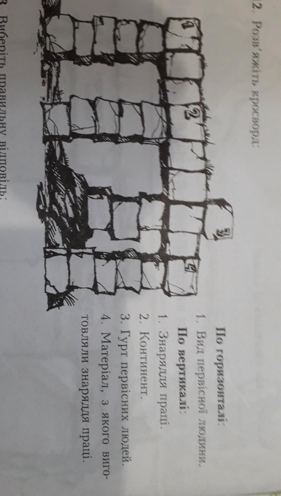 По горизонтали 1.Вид первобытного человека По вертикали 1.Оружие труда 2.Континент 3.Група первобытных людей 4.Материал из которого изготовляли орудие труда