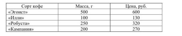 в магазине продаётся разных сортов таблицы данных статья за упаковки и её цена нужно купить 1 кг кофе одного сорта нужно со Сколько будет стоить самая дешевая покупка Ответ дайте в рублях