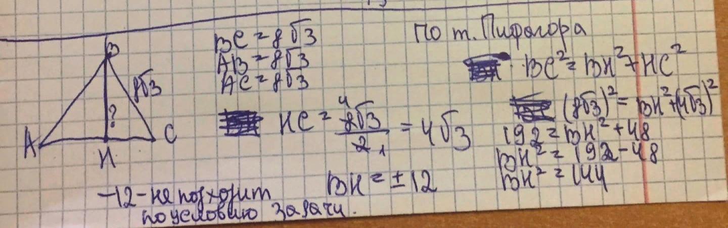 Найдите длину высоты равностороннего треугольника если его сторона равна 8корней из 3