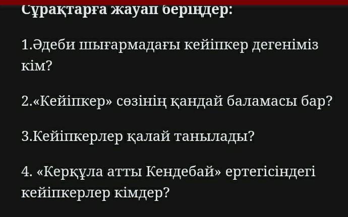 1.Кейіпкер – көркем шығармада суреттелетін оқиғаға қатысушы адам, әдеби образ. Әдебиетте адамның көркем бейнесін жасағанда, жазушы оның кескін-тұлғасын, іс-әрекетін, мінезін сол ортаның, дәуірдің өзгешеліктерін танытатын типтік сипаттарымен қатар өзінің басына ғана тән ерекшеліктерді де анық байқалатындай етіп суреттейді.