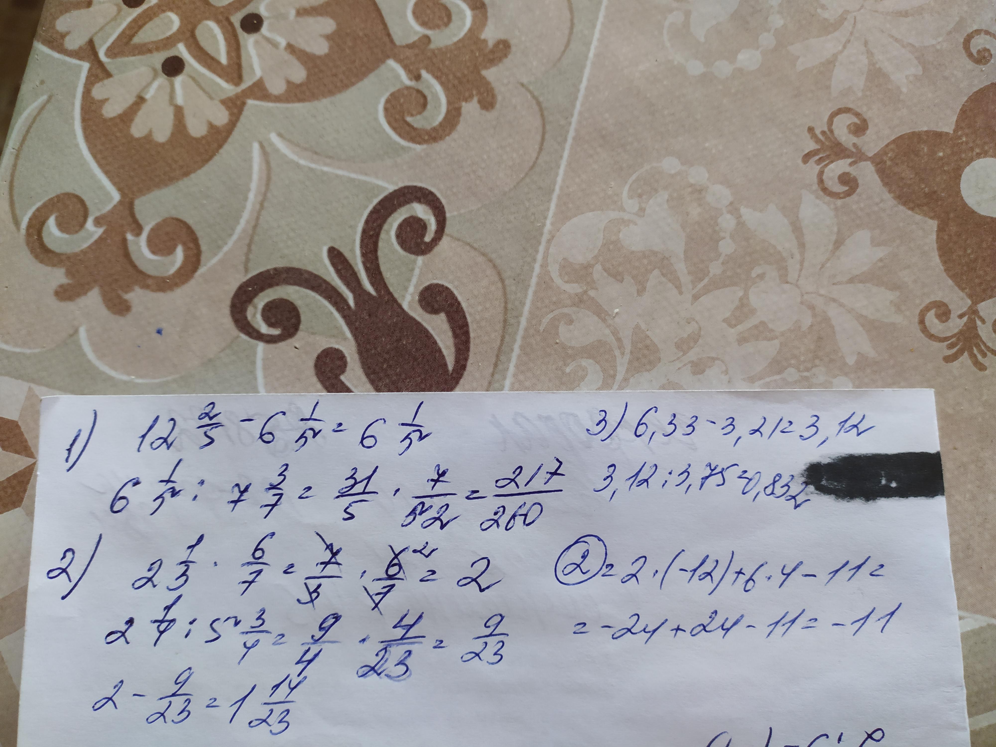 1) (12 целых 2/5-6 целых 1/5): 7 целых 3/7 2) 2 целых 1/3× 6/7 - 2 целых 1/4: 5 целых 3/4 3) (6,33-3,21):3,75