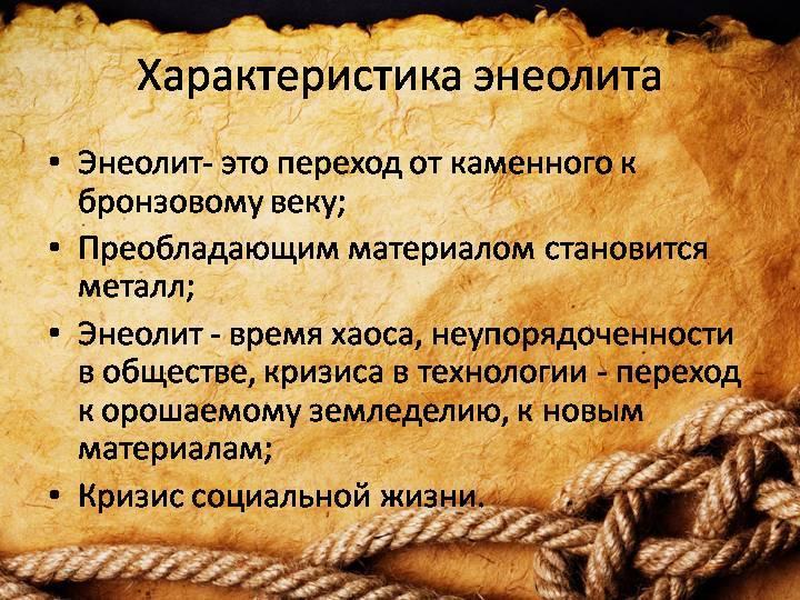 Энеолит-эпоха в развитии человечества, переходный период от неолита (нового каменного века) к бронзовому веку