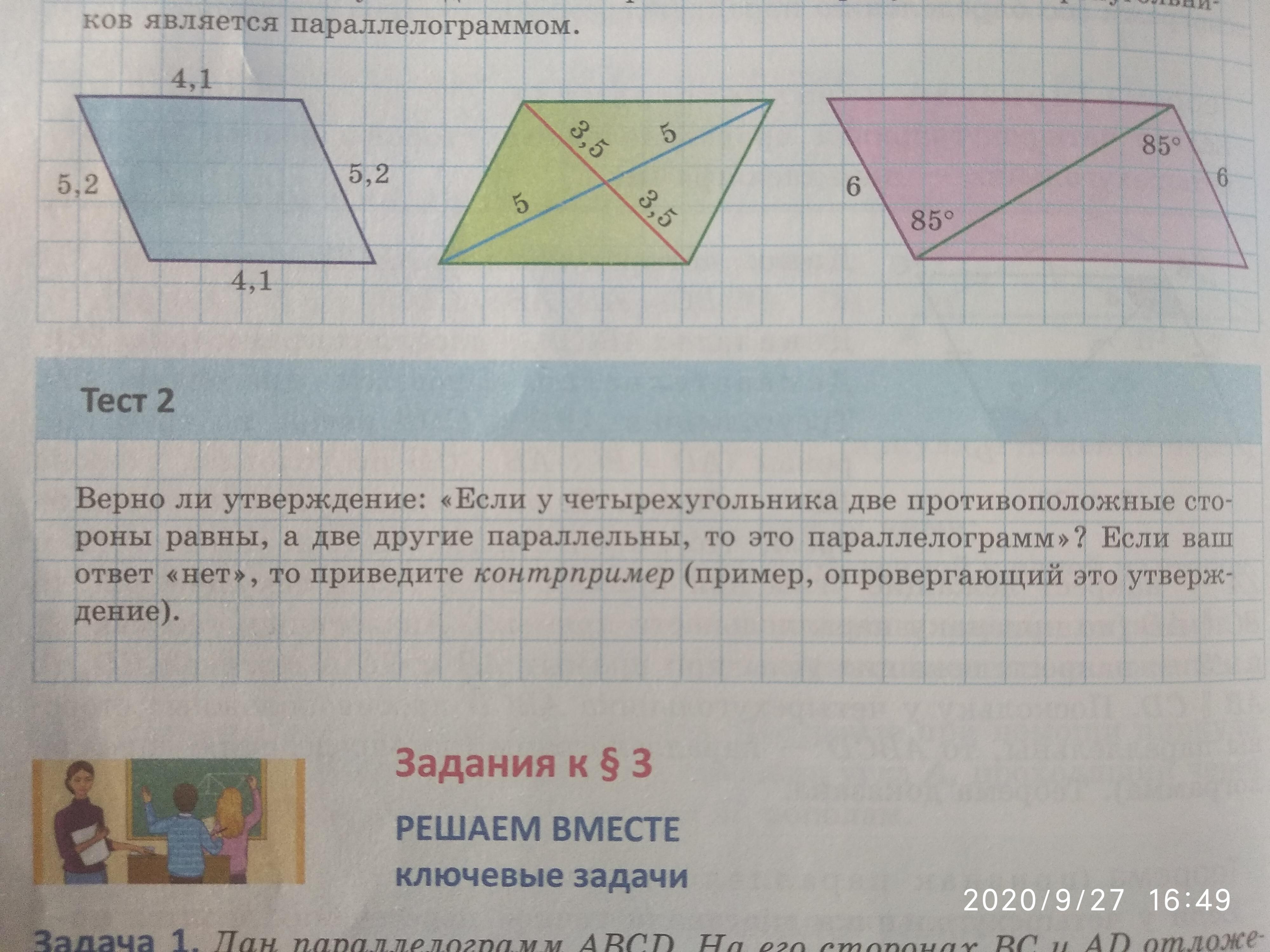 Верно ли утверждение: «Если у четырехугольника две противоположные стороны равны, а две другие параллельны, то это параллелограмм»? Если ваш ответ «нет», то приведите контрпример (пример, опровергающий это утверждение).