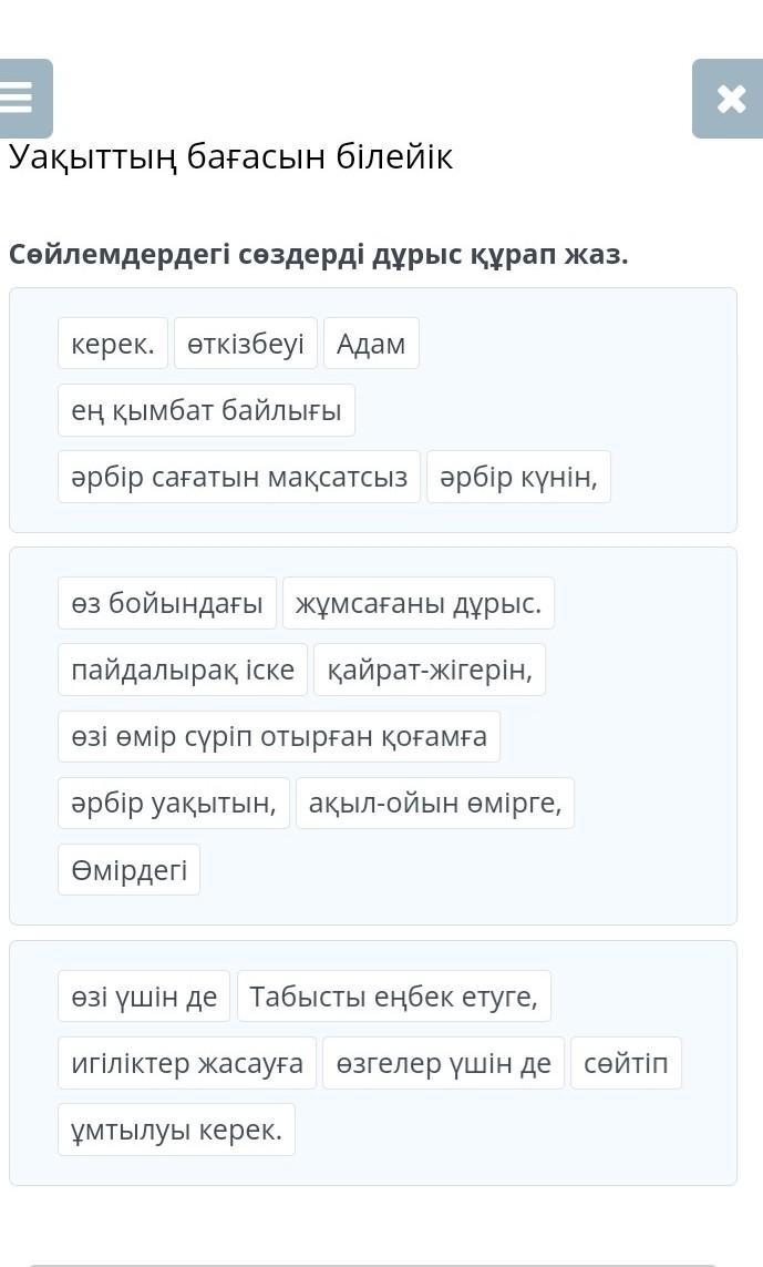 Первое правильно. второе не правильно( 4 таблички(өзі омір сүріп отырған қоғамға, ақыл-ойын өмірге, қайрат-жігерін, әрбір уақытын)) 3. Табысты еңбек етуге, сөйтіп өзі үшін де ...(дальше правильно)