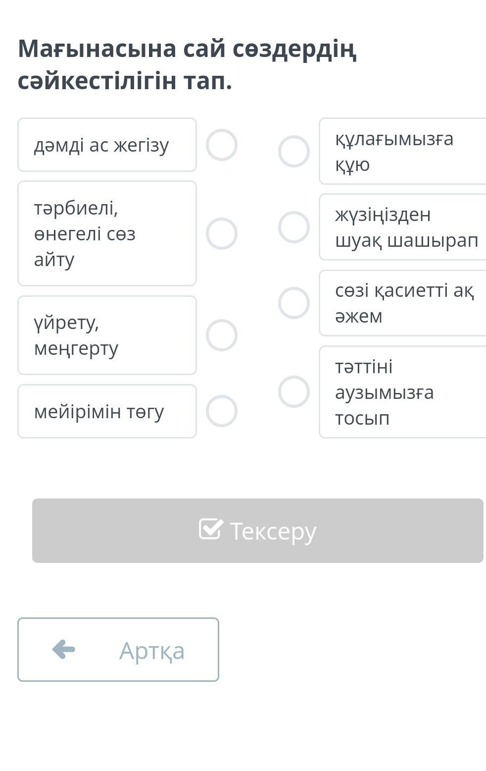 Мағынасына сай сөздердің сәйкестілігін тап.