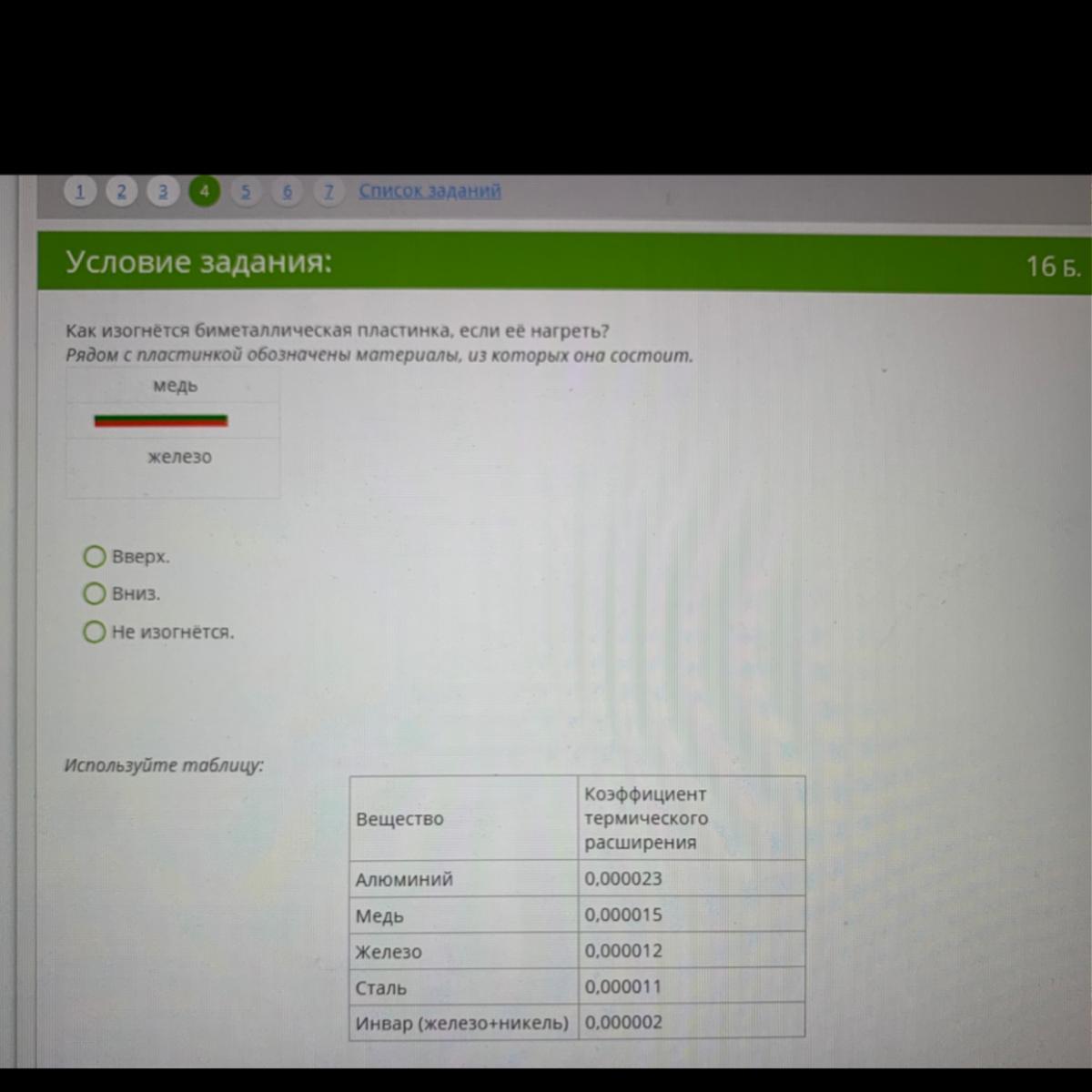 У меди коэффициент больше, значит и расширится он больше. Вниз.
