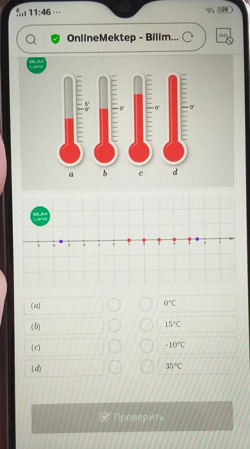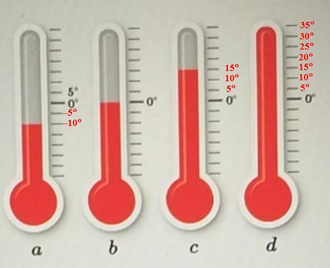 По рисунке видно, что каждое деление термометра равно 5°С. Учитывая то, что ниже 0° расположены отрицательные числа, а выше нуля положительные числа заполним нужные деления термометров (рис. 1).