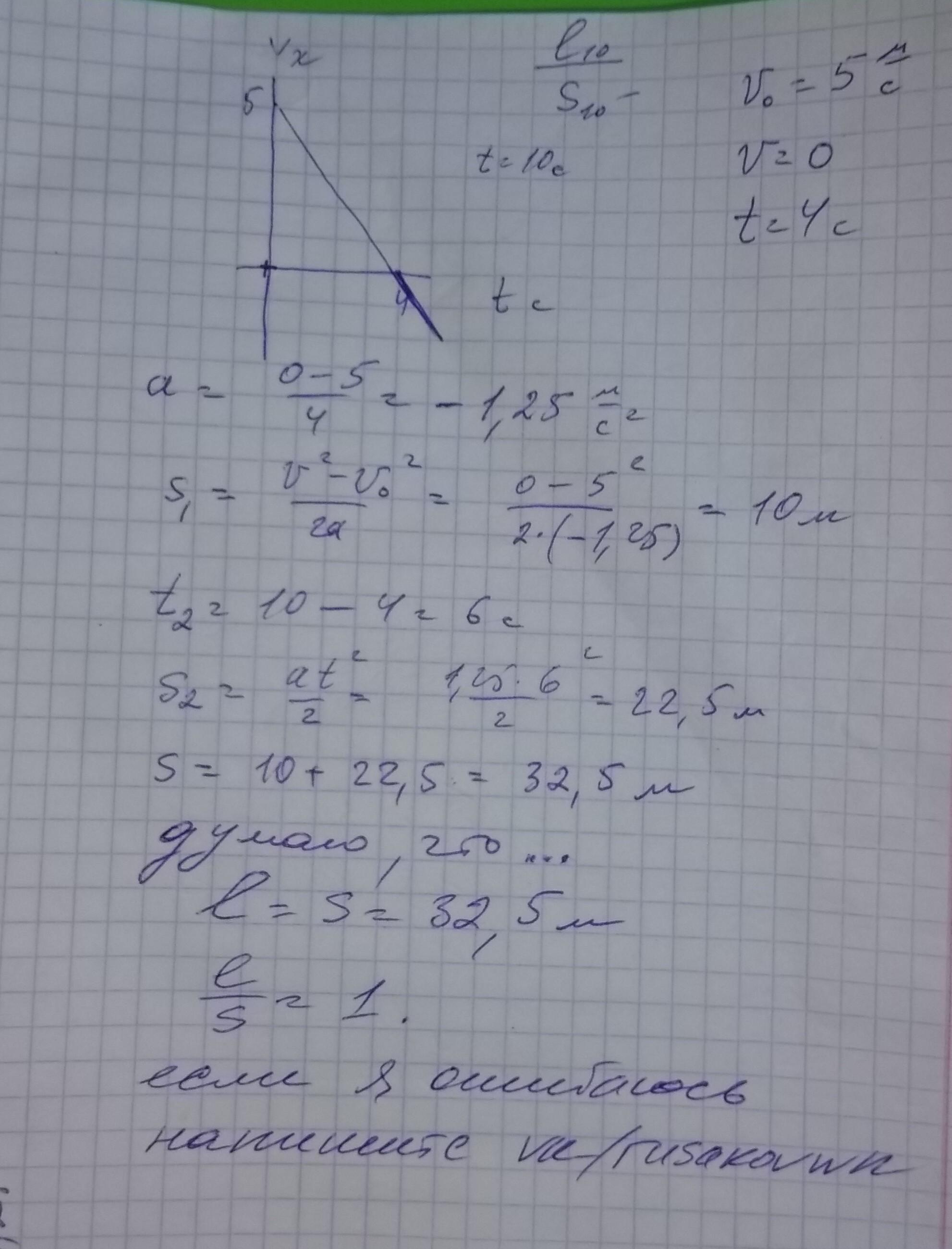 Тело движется вдоль оси Ох. Если график зависимости проекции скорости тела на эту ось времени Vx(t) изображается прямой, проходящей через точки (0;5) и (4;0) (t-в секундах, Vx- в метрах в секунду), то путь, пройденный телом за первые десять секунд движения, больше модуля перемещения тела за то же время в ... раз.
