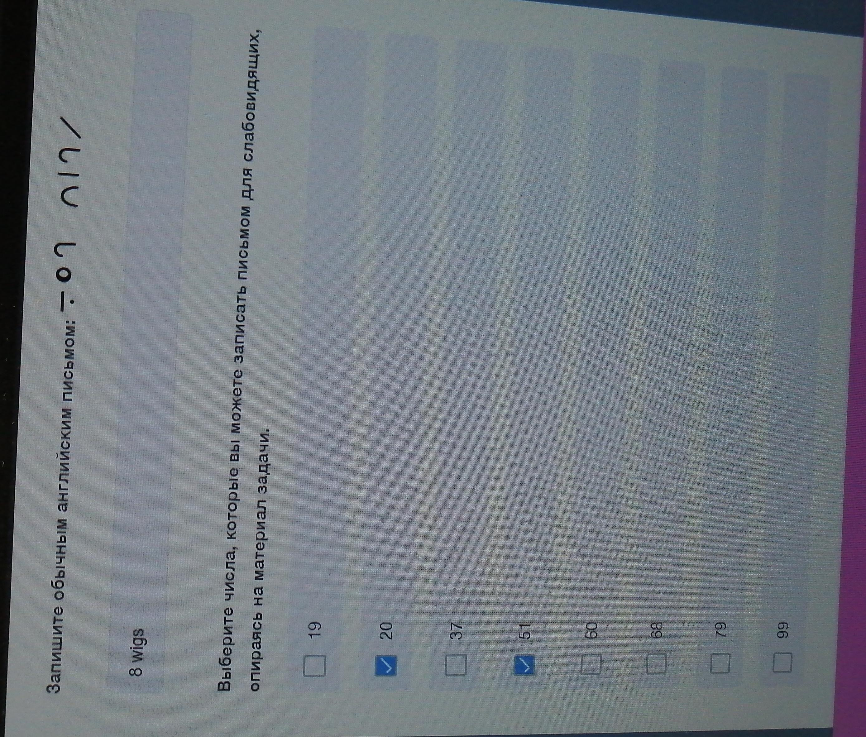 Установите правильные соответствия.Выберите числа, которые вы можете записать письмом для слабовидящих, опираясь на материал задачи.