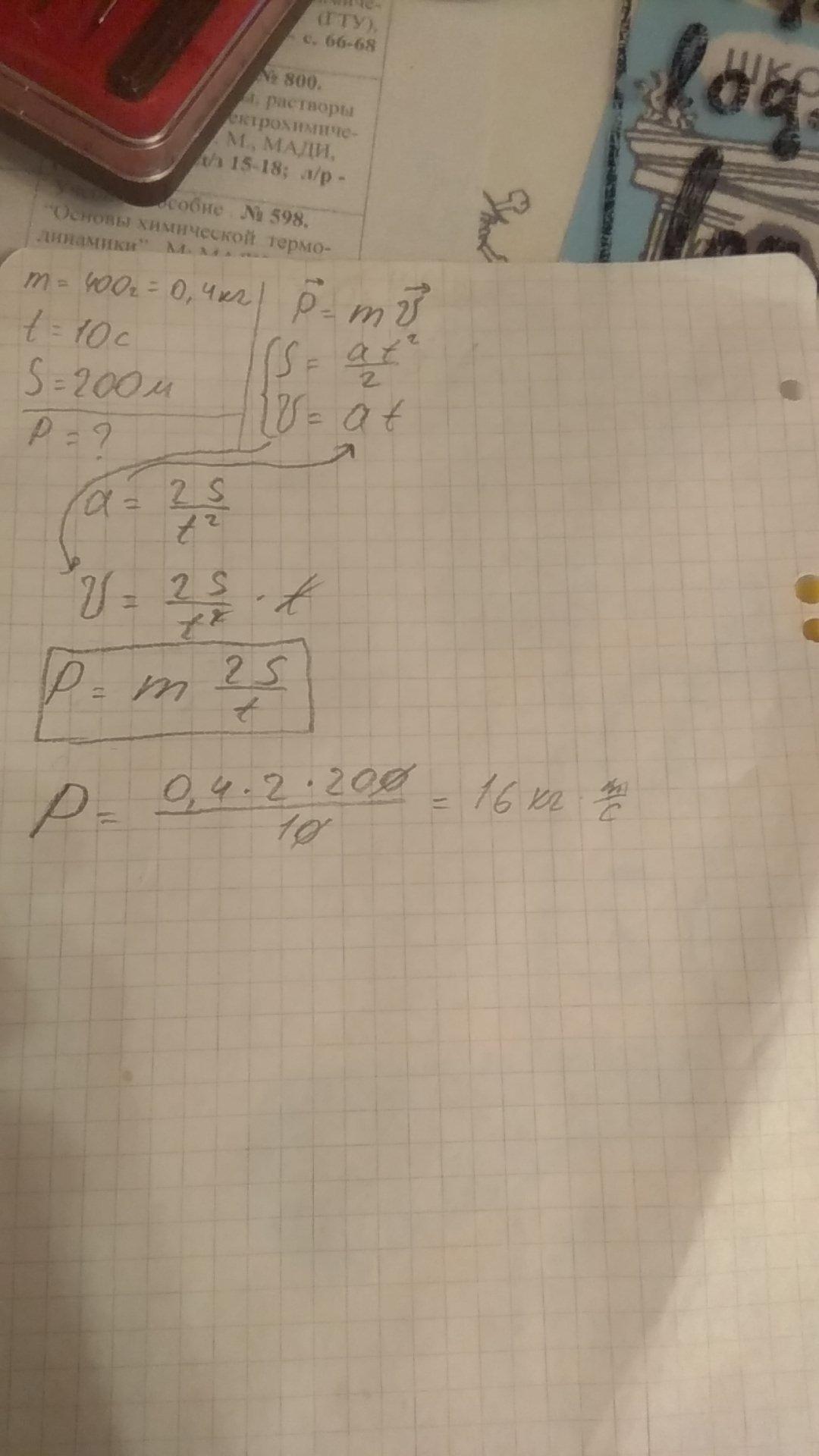 Тело массой 400 г начинает равноускоренное движение из состояния покоя и за время I = 10с проходит путь 200 м. Определить импульс тела в конце 10-й секунды.