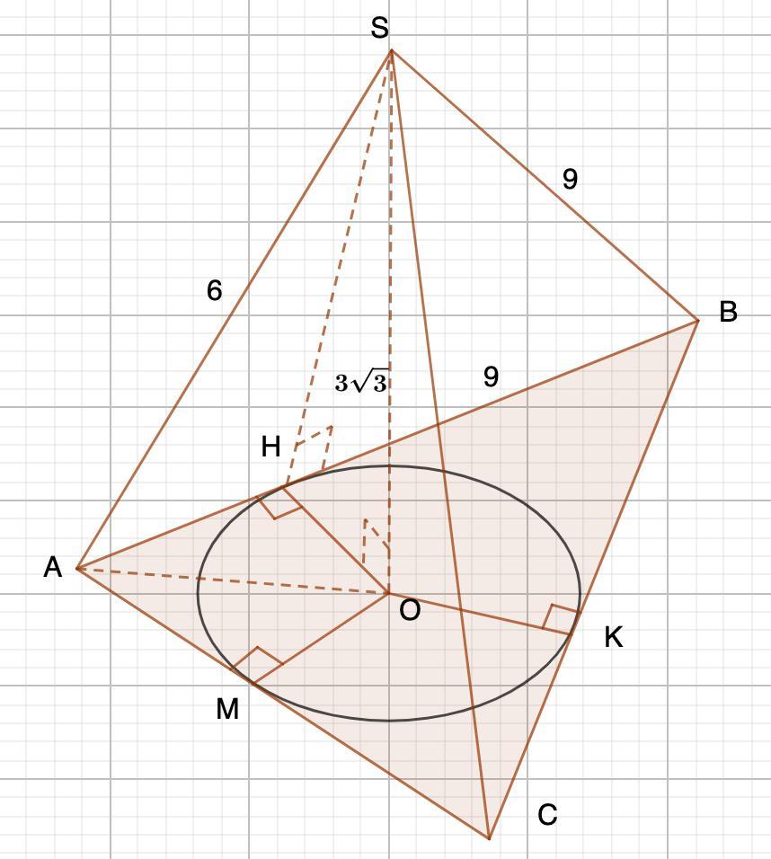 SA=6 дм; SВ=9 дм; АВ=9 дм; SО=3√3 дм.