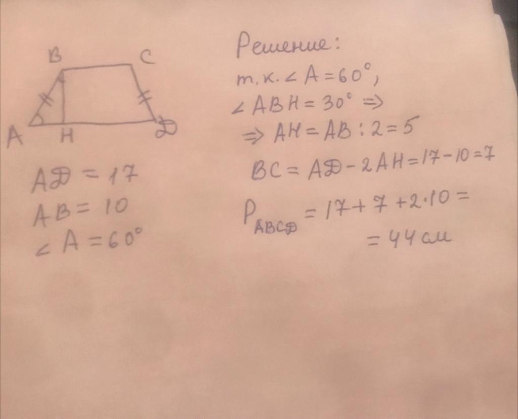 У рівнобічній трапеції більша основа дорівнює 17 см, бічна сторона 10 см, а кут між ними 60°. Знайдіть її периметр.