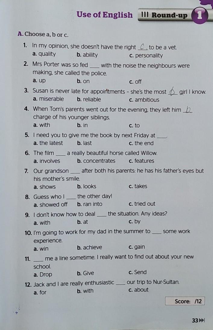 . In my opinion, she doesn't have the right a. quality to be a vet. b. ability C. personality 3. Susan is never late for appointments - she's the most dn 'e girl I know. a. miserable b. reliable C. ambitious 4. When Tom's parents went out for the evening, they left him charge of his younger siblings. a. with b. in C. to 5. I need you to give me the book by next Friday at a. the latest b. last C. the end a really beautiful horse called Willow. b. concentrates 6. The film a. involves c. features 7. Our grandson his mother's smile. after both his parents: he has his father's eyes but a. shows b. looks C. takes 8. Guess who I a. showed off the other day! b. ran into c. tried out 9. I don't know how to deal the situation. Any ideas? a. with b. at c. by 10. I'm going to work for my dad in the summer to experience. some work a. win b. achieve C. gain me a line sometime. I really want to find out about your new 11. school. a. Drop 12. Jack and I are really enthusiastic b. Give c. Send our trip to Nur-Sultan. C. about a. for b. with c. about
