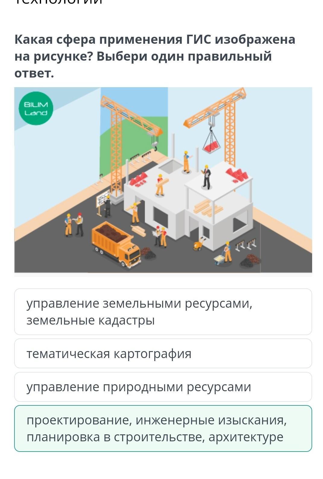Какая сфера применения ГИС изображена на рисунке? Выбери один правильный ответ. проектирование, инженерные изыскания, планировка в строительстве, архитектуре управление земельными ресурсами, земельные кадастры управление природными ресурсами тематическая картография