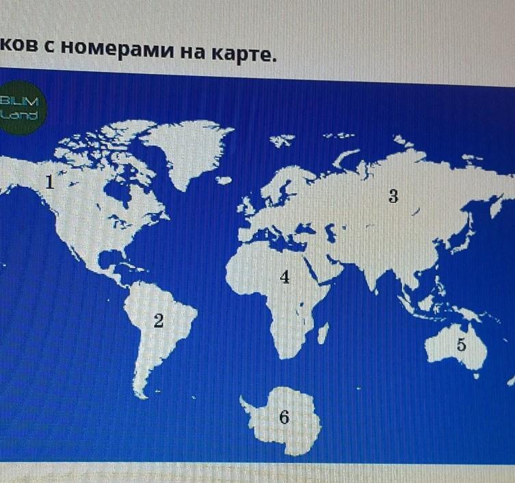 Соотнеси названия материков с номерами на карте.