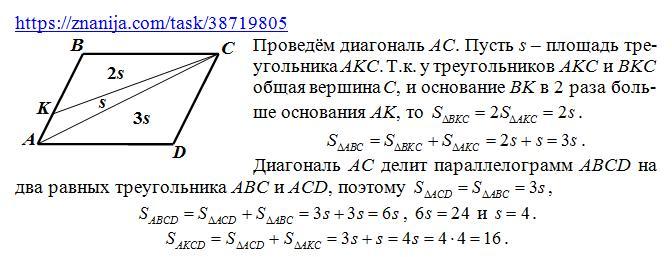 На стороне AB параллелограмма ABCD отмечена такая точка K, что AK : KB = 1 : 2. Найдите площадь четырехугольника AKCD, если площадь параллелограмма ABCD равна 24.