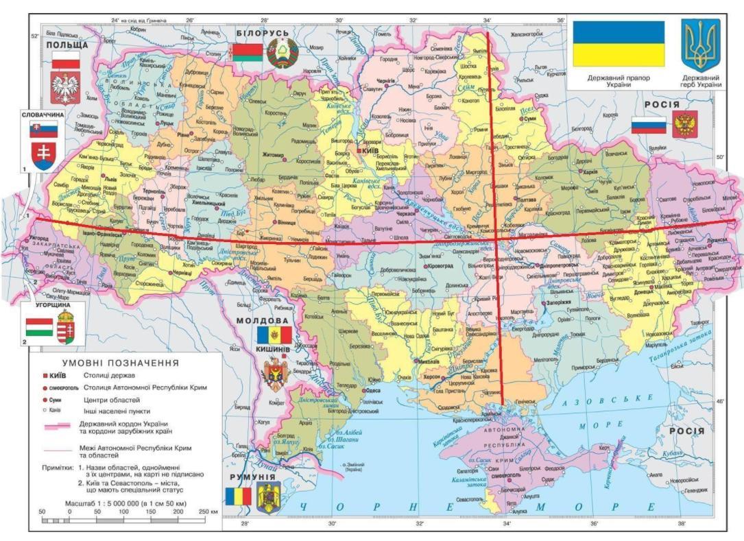 Визначте протяжність території України в градусах і кілометрах, користуючись фізичною картою атласу