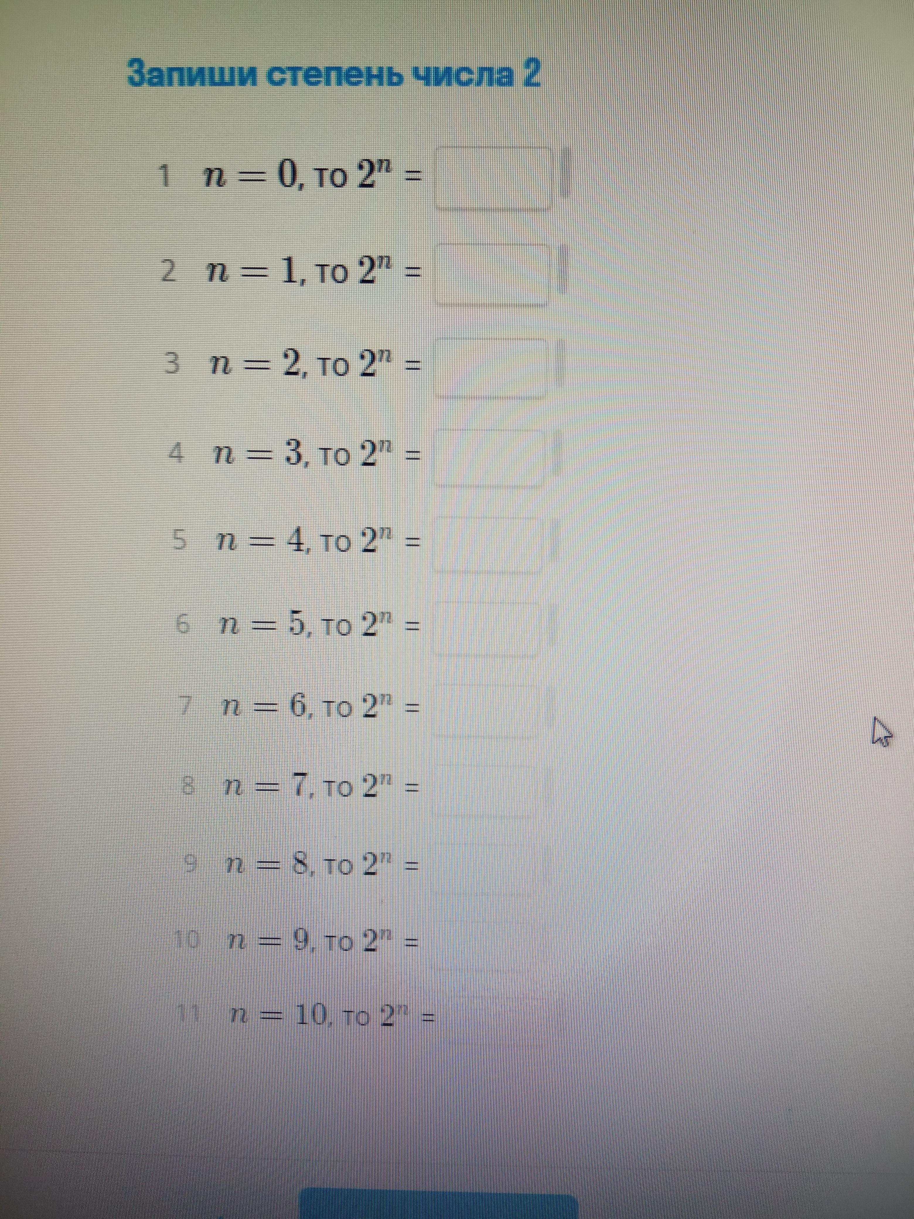 1, 2, 4, 8, 16, 32, 64, 128, 256, 512, 1024